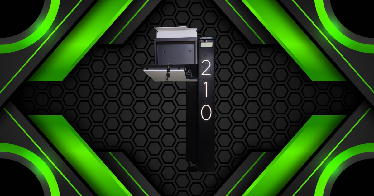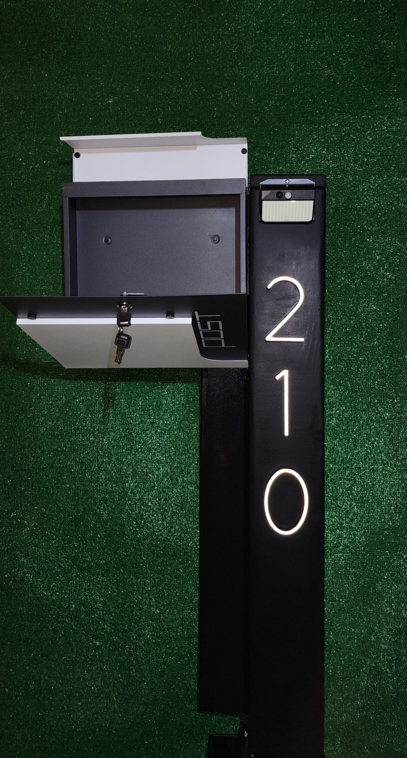Ro-Mae is a modern and sleek mailbox design mounted on a vertically. The mailbox itself is rectangular with a front-opening door secured by a key lock, which is currently open. The top of the mailbox has a small overhang likely to protect against rain. On the vertical post beside the mailbox, there is a solar light illuminating your house number that is prominently displayed in large numbers, giving it a stylish and contemporary look. This model comes paired with an address plaque. Ro-Mae gives off a refined, modern vibe, functional yet sophisticated, perfect for a home that values both design and practicality.